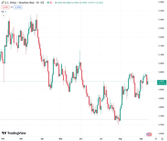 The Brazilian real, represented by the USD/BRL currency pair, initially increased to approximately 4.9680 and later stabilized at 4.9450.