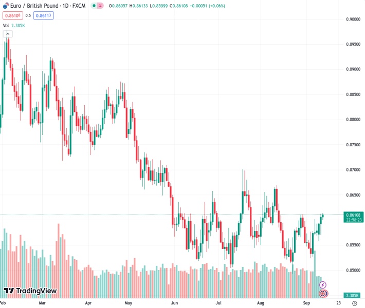 EURGBP currently trading at 0.8609 at the time of writing. Pair opened at 0.8594 and is trading with a change of 0.17 % .