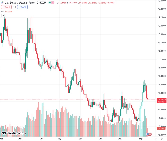 USDMXN currently trading at 17.2527 at the time of writing. Pair opened at 17.2748 and is trading with a change of -0.13 % .
