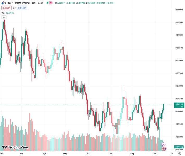 EURGBP currently trading at 0.8625 at the time of writing. Pair opened at 0.8613 and is trading with a change of 0.14 % .
