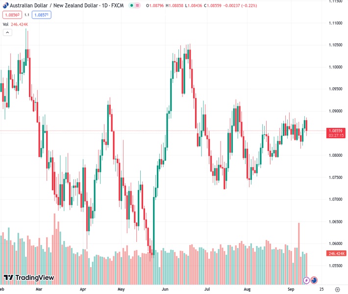 AUDNZD currently trading at 1.0856 at the time of writing. Pair opened at 1.0886 and is trading with a change of -0.28 % .