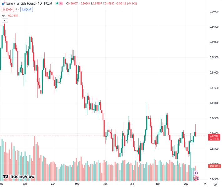- EUR/GBP trades at 0.8595, down 0.12%, as traders position for a possible ECB rate hike of 25 basis points.