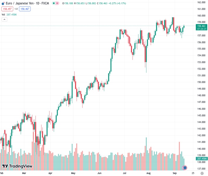 EURJPY currently trading at 158.38 at the time of writing. Pair opened at 158.26 and is trading with a change of 0.08 % .