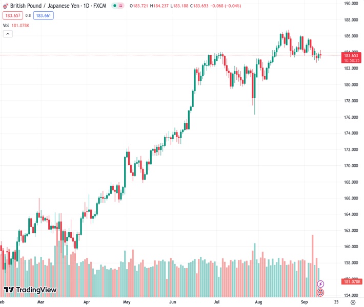 The GBPJPY currency pair has bounced back strongly from a low of 183.20, forming a V-shaped recovery. This has occurred because investors anticipate that the Bank of Japan (BoJ) will continue to implement measures to further tighten its monetary policy.