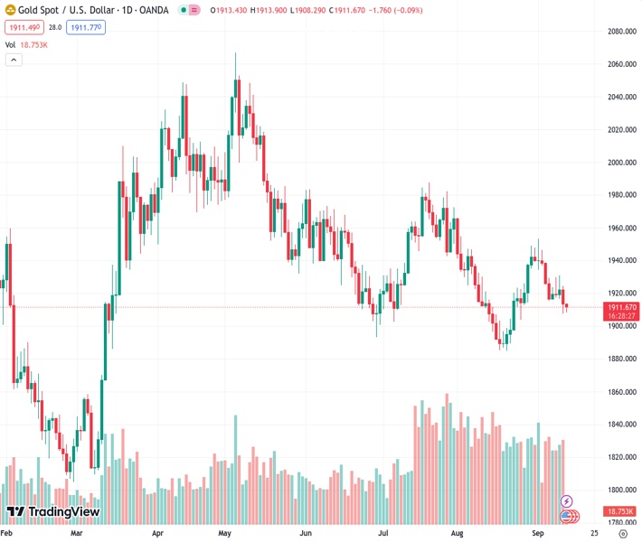 The price of gold, indicated by #XAUUSD at $1,911.72, has trended downwards for the second consecutive day and is encountering difficulty in staying above the lowest point of the month.