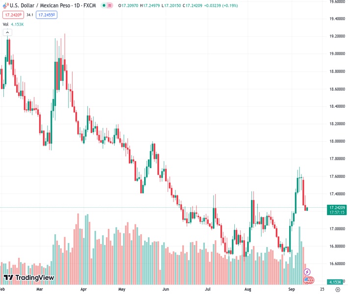 USDMXN currently trading at 17.2422 at the time of writing. Pair opened at 17.2274 and is trading with a change of 0.09 % .