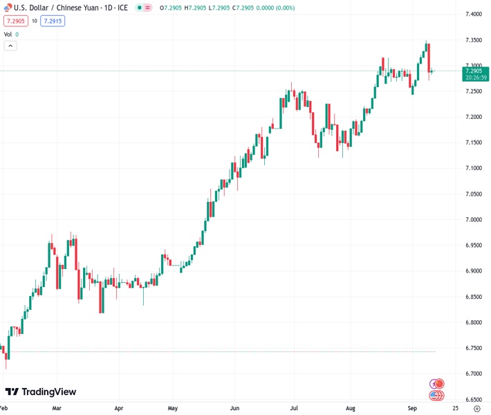 The USDCNY exchange rate is currently at 7.30104, while the People’s Bank of China (PBOC) has set the reference rate at 7.1894 compared to the previous rate of 7.1986.