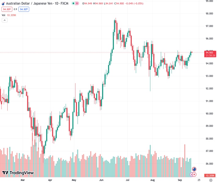 AUDJPY currently trading at 94.95 at the time of writing. Pair opened at 94.69 and is trading with a change of 0.27 % .