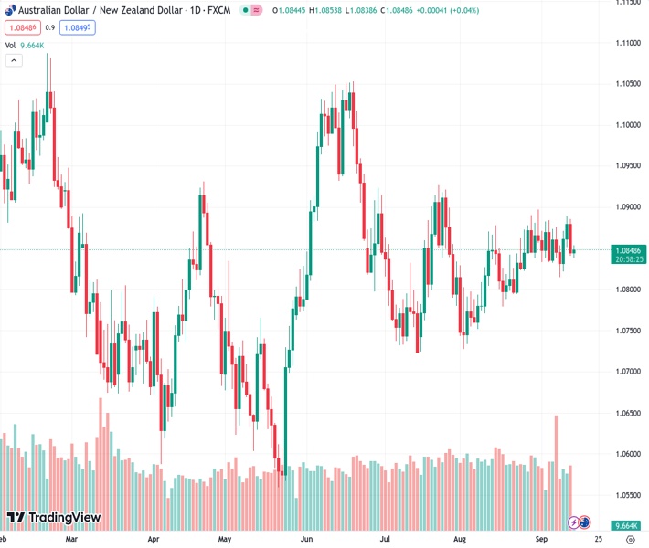 AUDNZD currently trading at 1.084 at the time of writing. Pair opened at 1.0886 and is trading with a change of -0.42 % .
