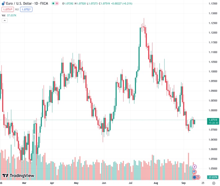 The EUR/USD currency pair, currently trading at 1.07515, has regained the value it previously lost and is maintaining a position above the 1.0750 level.