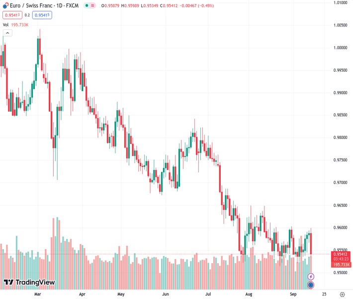EURCHF currently trading at 0.9541 at the time of writing. Pair opened at 0.9589 and is trading with a change of -0.5 % .