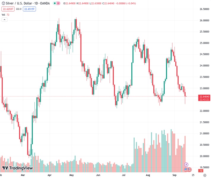 - XAG/USD declined to a low of $22.30 but settled at $22.60.