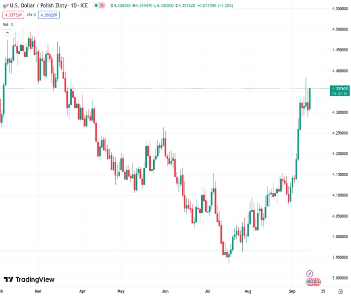 The lack of confidence in the Polish central bank has led to the weakening of the Polish Zloty (PLN), currently valued at 4.35739 against the US Dollar (USD).
