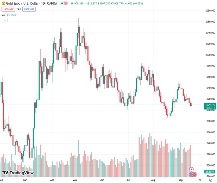 The price of gold at $1,909.55 remains stable and breaks a series of losses, staying above the $1,900 mark.