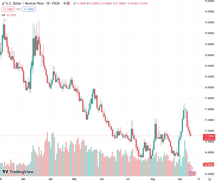 The US dollar against the Mexican peso is currently valued at 17.1127, which represents a 0.23% decrease from the previous rate of 17.1119. This decline is attributed to underwhelming US Retail Sales figures, although there was positive news from better-than-expected jobless claims and Producer Price Index (PPI) data.