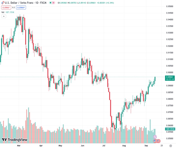 USDCHF currently trading at 0.8961 at the time of writing. Pair opened at 0.8937 and is trading with a change of 0.27 % .
