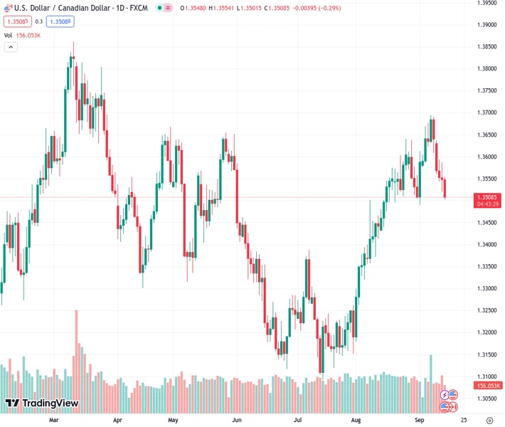 - USD/CAD tallied its fifth day in a row of losses of 1.3515.