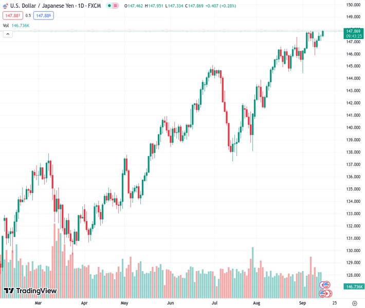 Danske Bank predicts that the USDJPY pair, currently at a rate of 147.873, will likely trend in the direction of appreciation over the next six to twelve months.