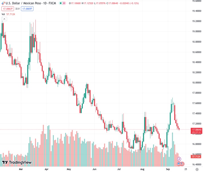 USDMXN currently trading at 17.0887 at the time of writing. Pair opened at 17.1102 and is trading with a change of -0.13 % .