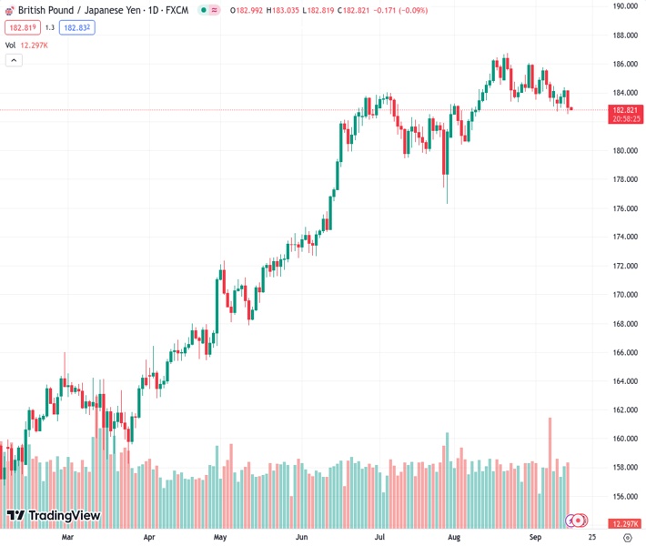 The Pound Sterling (GBP) has struggled to develop further momentum against the Japanese Yen (JPY) recently, with the Guppy flagging towards the 50-day Simple Moving Average (SMA) after failing to maintain a hold of the 186.00 major level in late August.