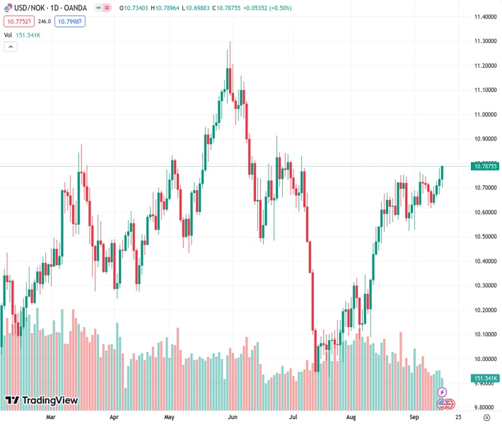 The USD to NOK exchange rate, which was at 10.77079, experienced a positive change on Friday, increasing by 0.50% from its previous rate of 10.788.