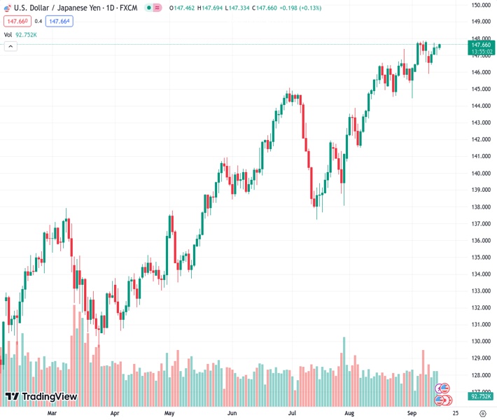 The USDJPY currency pair remains strong and close to 147.50, with a slight increase of 0.02% for the day.