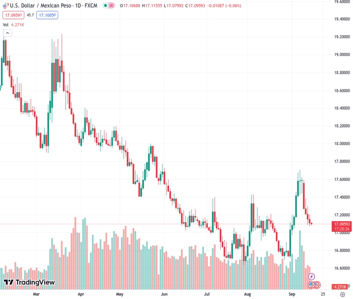 The USDMXN exchange rate of 17.0935 continues to stay at a low level close to the lowest point it reached in the past 1.5 weeks, which occurred on Thursday.