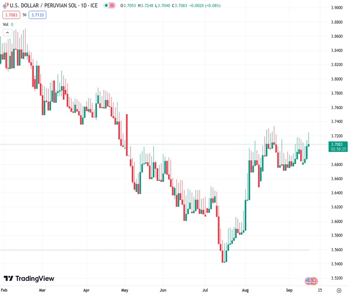 - USD/PEN increased 0.30% and got rejected by the 200-day SMA at 3.7220.