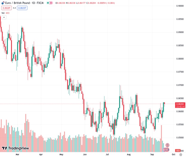 EURGBP currently trading at 0.8632 at the time of writing. Pair opened at 0.8604 and is trading with a change of 0.33 % .