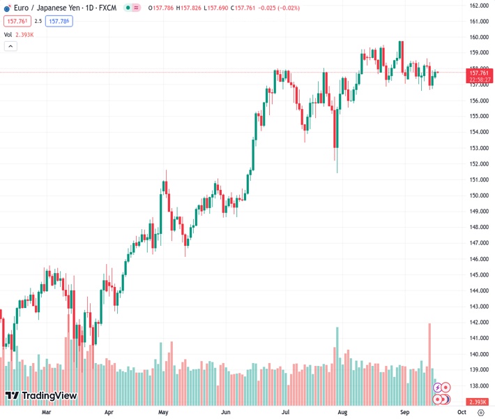 EURJPY currently trading at 157.8 at the time of writing. Pair opened at 157.58 and is trading with a change of 0.14 % .