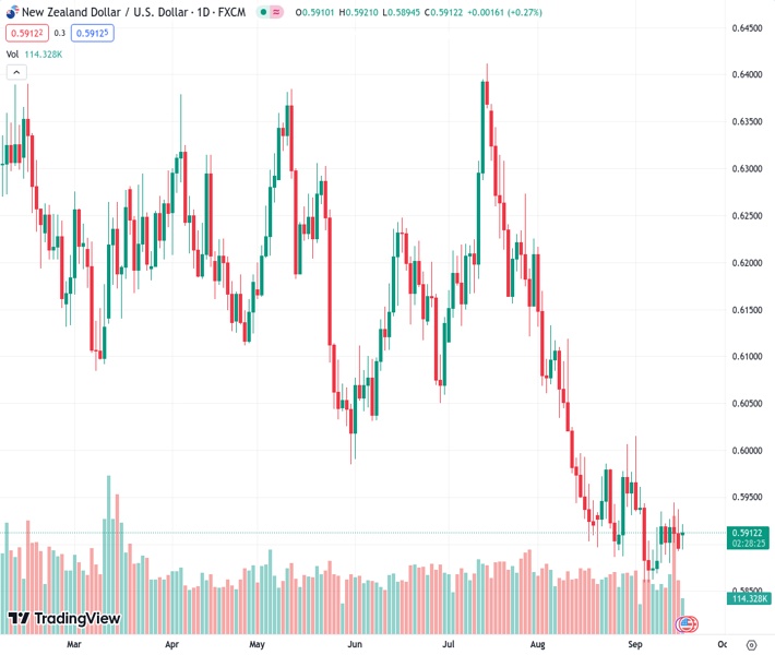 The NZD to USD exchange rate is currently at 0.5917, which is an increase of 0.37%. This gain has occurred due to a decrease in US Treasury bond yields, which is benefiting the New Zealand dollar.