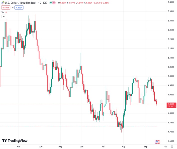 The US dollar to Brazilian real exchange rate, currently at 4.84990, decreased to around 4.8475, resulting in a loss of over 2% throughout September.