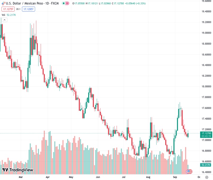 • USD/MXN trades at 17.1182, rebounding from a daily low of 17.0296, as markets anticipate key central bank decisions this week.