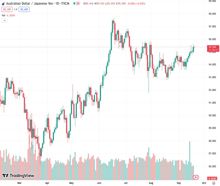 AUDJPY currently trading at 95.39 at the time of writing. Pair opened at 95.02 and is trading with a change of 0.39 % .