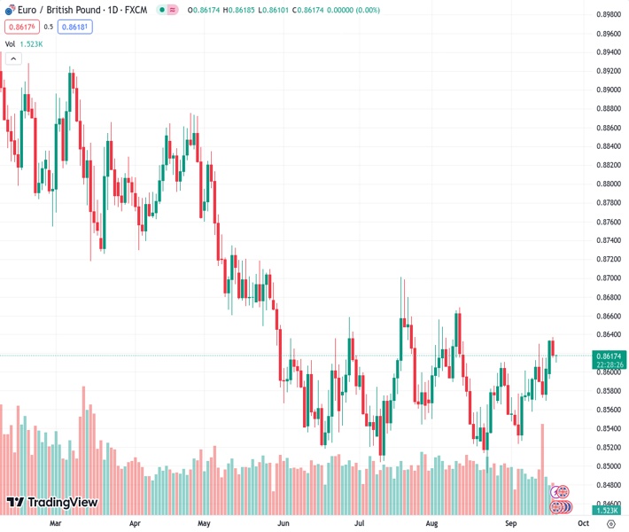EURGBP currently trading at 0.8618 at the time of writing. Pair opened at 0.8634 and is trading with a change of -0.19 % .