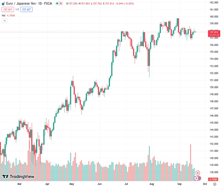 EURJPY currently trading at 157.89 at the time of writing. Pair opened at 157.82 and is trading with a change of 0.04 % .