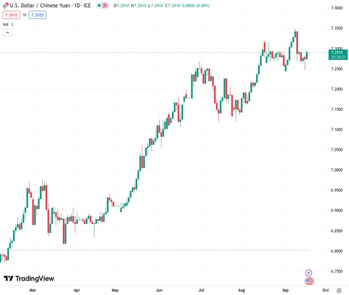 The exchange rate of USDCNY is at 7.29672, while the People’s Bank of China (PBOC) has established a reference rate at 7.1733, slightly lower than the previous rate of 7.1736.