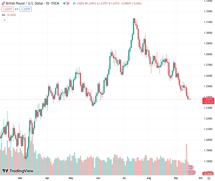 The GBPUSD pair, currently at a level of 1.23785, is still facing difficulties in making a significant rebound from its lowest point in several months.