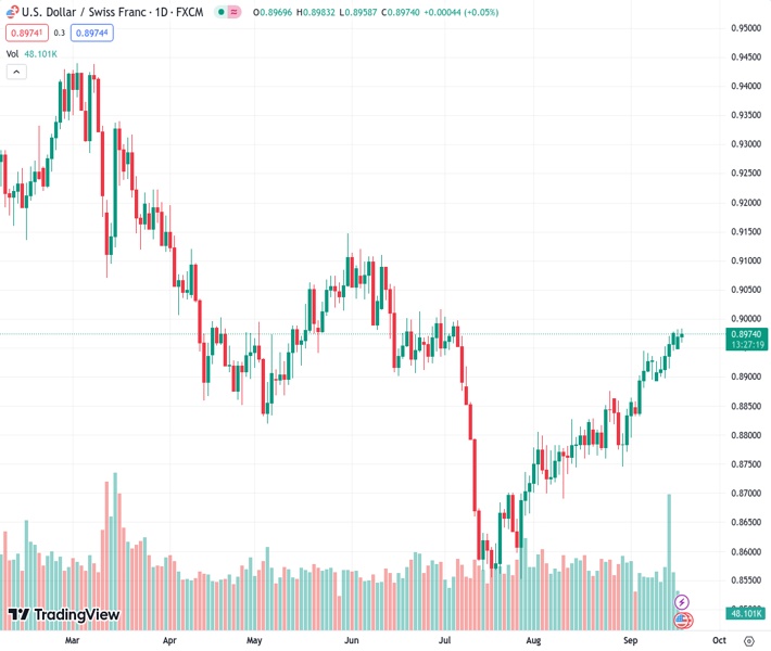 USDCHF currently trading at 0.8978 at the time of writing. Pair opened at 0.897 and is trading with a change of 0.09 % .