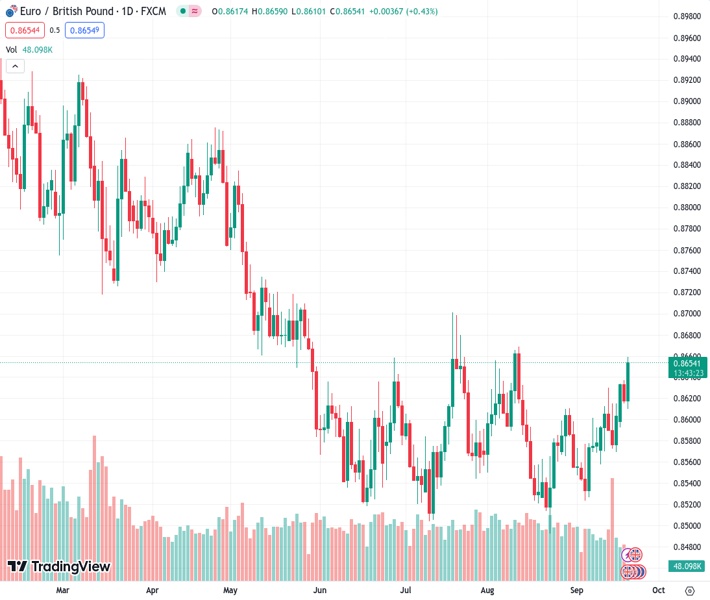 EURGBP currently trading at 0.8646 at the time of writing. Pair opened at 0.8618 and is trading with a change of 0.32 % .