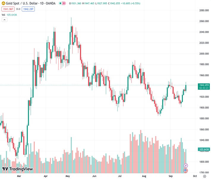 The Federal Reserve has maintained interest rates as expected, at a range of 5.25-5.50%, with the current price of gold against the US dollar standing at 1,941.74.