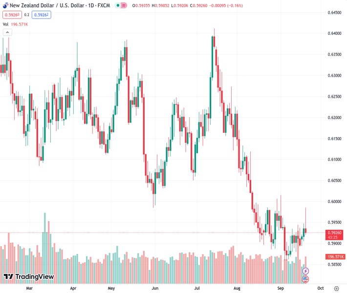 The NZDUSD exchange rate at 0.59233 experienced a change in direction and dropped to around 0.5930, following its previous peak at 0.5985.