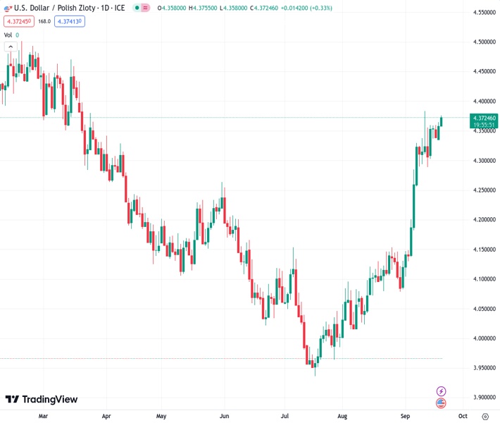 The Polish currency (PLN) is being weakened by the surprise rate cut from the National Bank of Poland (NBP) as the country prepares for a crucial parliamentary election. At the moment, the exchange rate for USD to PLN stands at 4.37249.