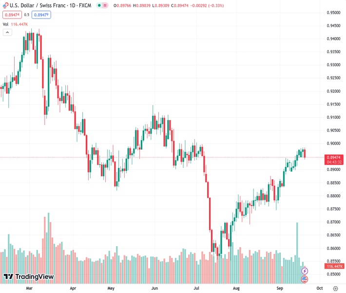 - USD/CHF declined by 0.28% on the day to 0.8950.
