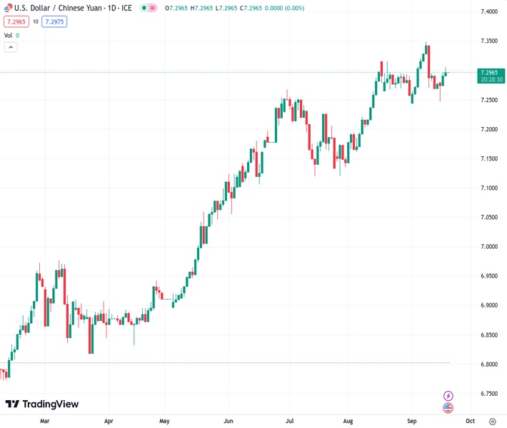 The USD to CNY exchange rate is set at 7.30247, with the People’s Bank of China (PBoC) establishing a reference rate of 7.1732 compared to the previous rate of 7.1733.