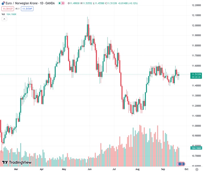 ING suggests that the exchange rate between the Euro and the Norwegian Krone, currently at 11.51336, will remain close to the 11.50 level until there are changes in the external factors influencing it.