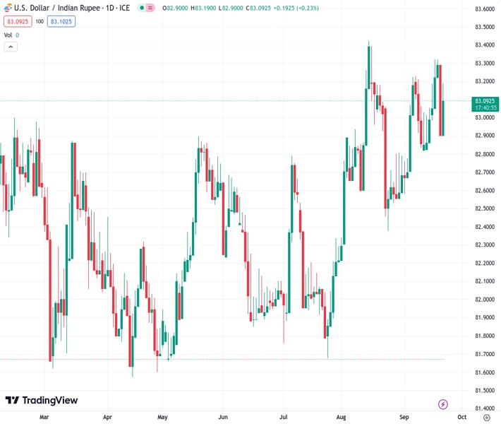 USDINR currently trading at 83.0292 at the time of writing. Pair opened at 83.0594 and is trading with a change of -0.04 % .
