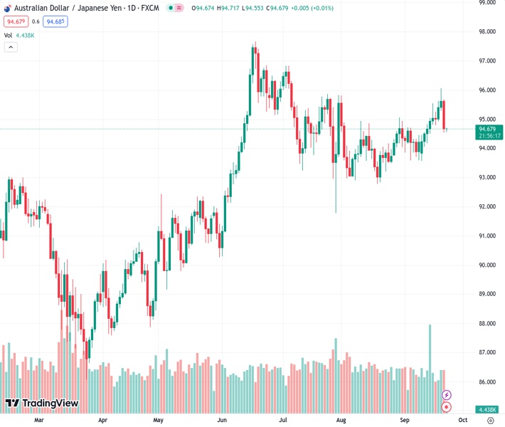 AUDJPY currently trading at 94.69 at the time of writing. Pair opened at 95.65 and is trading with a change of -1.0 % .