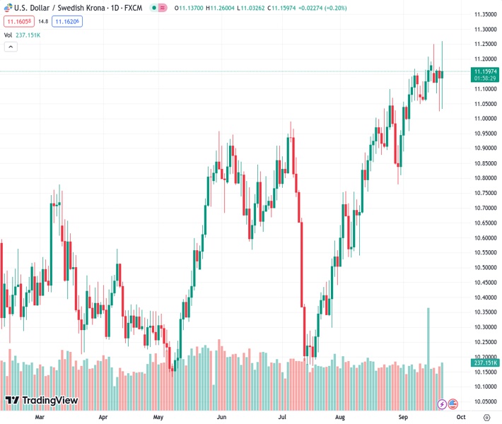 The exchange rate between the US dollar and the Swedish Krona, represented as USDSEK, rose from 11.15888 to 11.247, indicating a 1% increase. However, it then declined and returned to a value of 11.152.