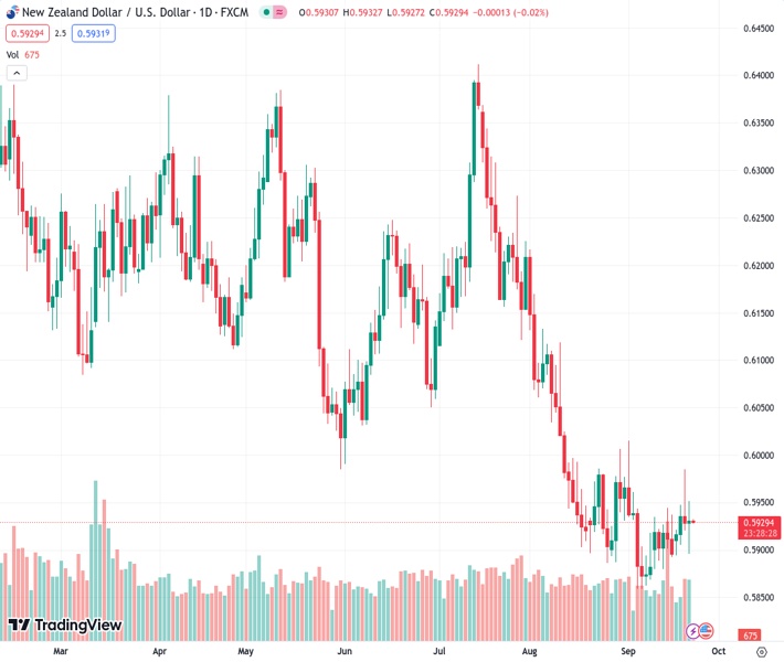 Daily candlesticks see the Kiwi trading into familiar five-week ranges after getting knocked back from the 34-day Exponential Moving Average (EMA) just above 0.5950.